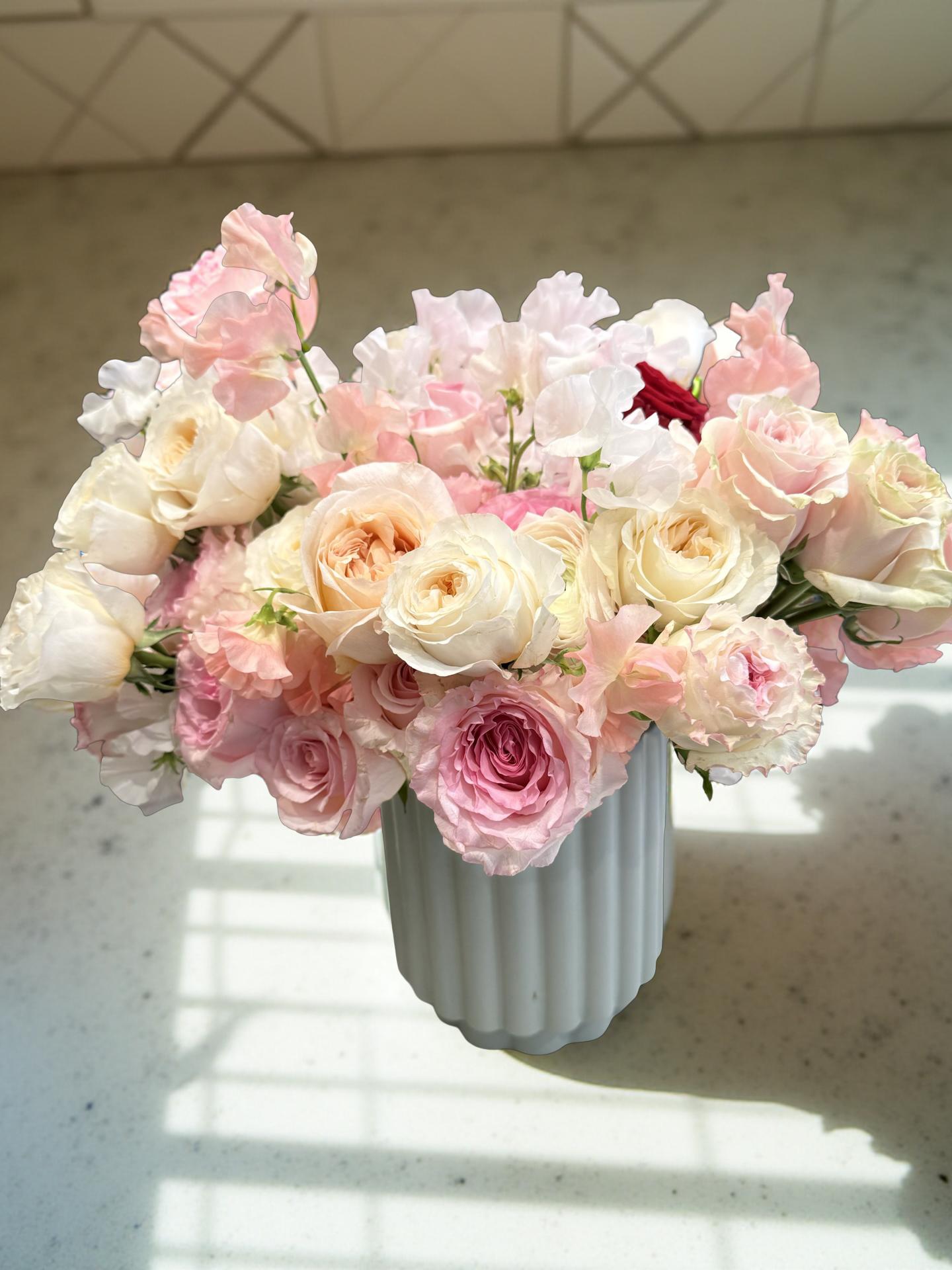 The flowers, color and container may vary according to availability and seasonality.
